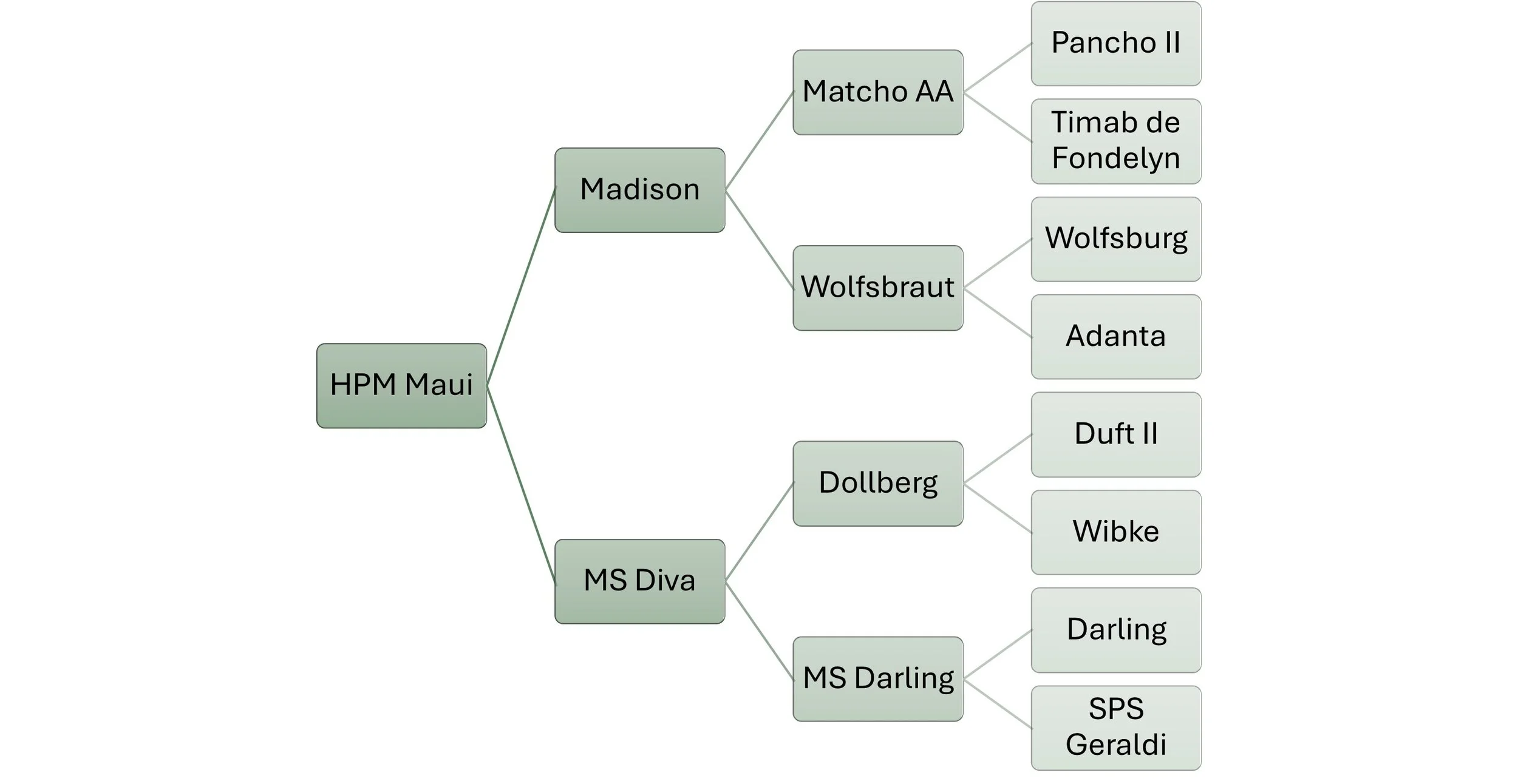 Widely considered to be the most influential son of Duallant, Duft II sired Darling, who is one of the more influential D-line dressage stallions. Maui’s dam, Diva, has the D-line on both the top and bottom of her pedigree.